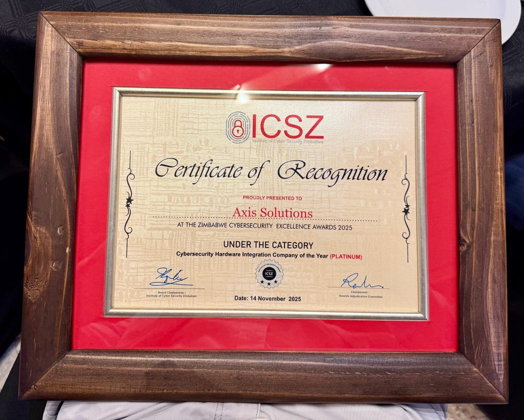 Axis Solutions is proud to announce it has been awarded the Cybersecurity Hardware Integration Company of the Year (Platinum) at the 2025 Zimbabwe Cybersecurity Excellence Awards 2025.